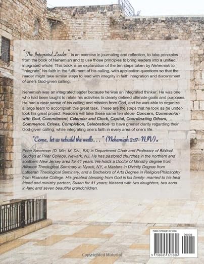 The Integrated Leader is an exercise in journaling and reflection, to take principles from the book of Nehemiah and to use those principles to bring leaders into a unified, integrated whole. This book is an explanation of the ten steps taken by Nehemiah to “integrate” his faith in the fulfillment of his calling, with application questions so that the reader might take similar steps to lead with integrity and to discern and fulfill one’s God-given calling.Nehemiah was an integrated leader because he was an integrated thinker. He was one who had been taught to relate his activities to clearly defined ultimate goals and purposes. He had a clear sense of his calling and mission from God, and he was able to organize a large team to accomplish this great task.